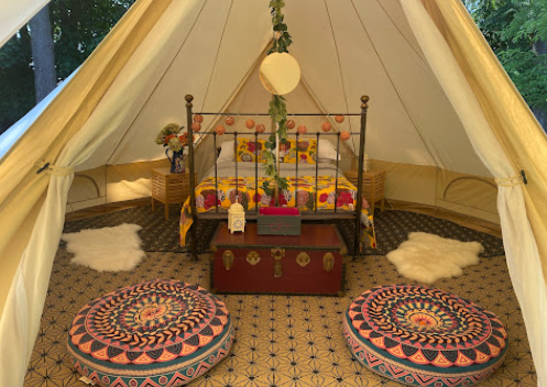 5m Bells - All our bell tents come with flooring, single camp beds, self inflating memory foam mats, a low bajot table with a lantern, cushions, solar lights and bunting. We have bedding packs available to hire in addition.